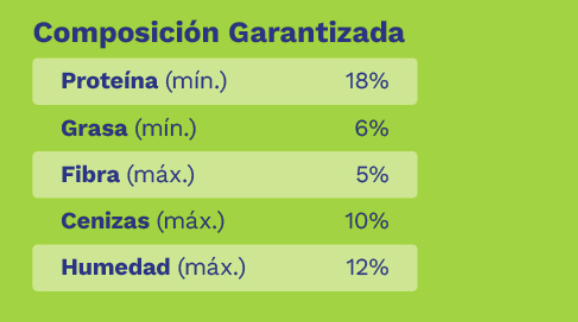 Maíz Amarillo y/o Sorgo, Arroz Cristal, Torta de Soya, Fríjol Soya Integral, Harina de Pollo, Harina de Carne, Mogolla de Trigo, Grasa animal, Sal común, Carbonato de Calcio, Fosfato Bicálcico, Vitamina A, Vitamina D3, Vitamina E, Vitamina B1, Vitamina B2, Vitamina B6, Vitamina K3, Vitamina B12, Niacina, Acido Pantoténico, Biotina, Acido Fólico, Colina, Sulfato Ferroso, Sulfato de cobre, Oxido de Zinc, E.D.D.l., Sulfato de Manganeso, Selenito de Sodio, Extracto de yuca Schidigera, Antioxidante (B.H.T.).