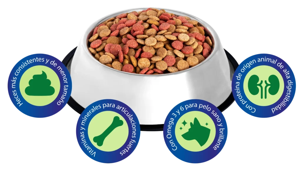Alimento para perros de todas las razas completo y balanceado con proteína de origen animal y con aceites Omega 3 y 6, que fortalecen los dientes, pelo más brillante y articulaciones fuertes.