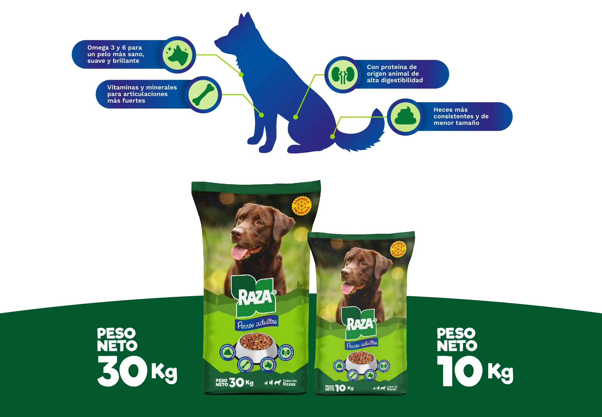 Alimento completo para perros de todas las razas. Suministre RAZA PERROS como único alimento a perros en mantenimiento de todas las razas.